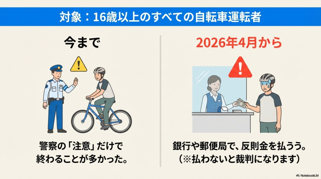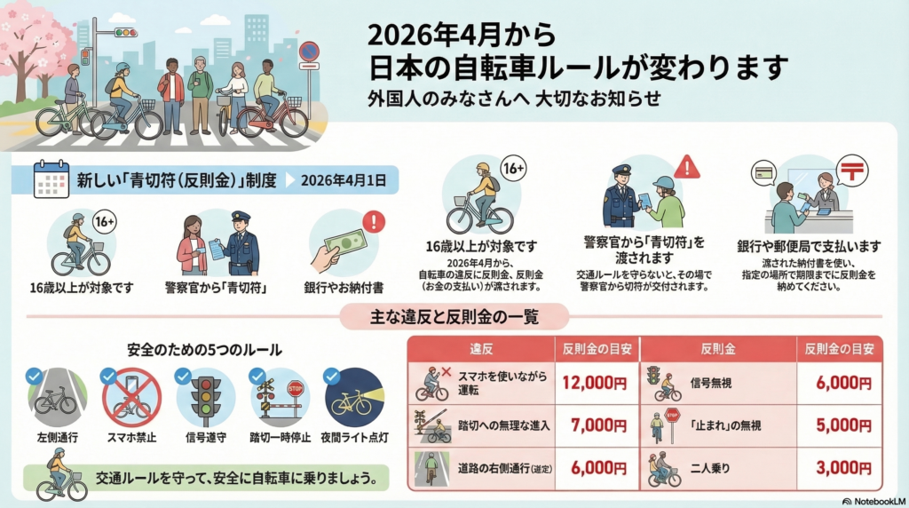 2026年(れいわ8年)4月1日から、自転車にも 「青切符(あおきっぷ)」 という制度が始まります。